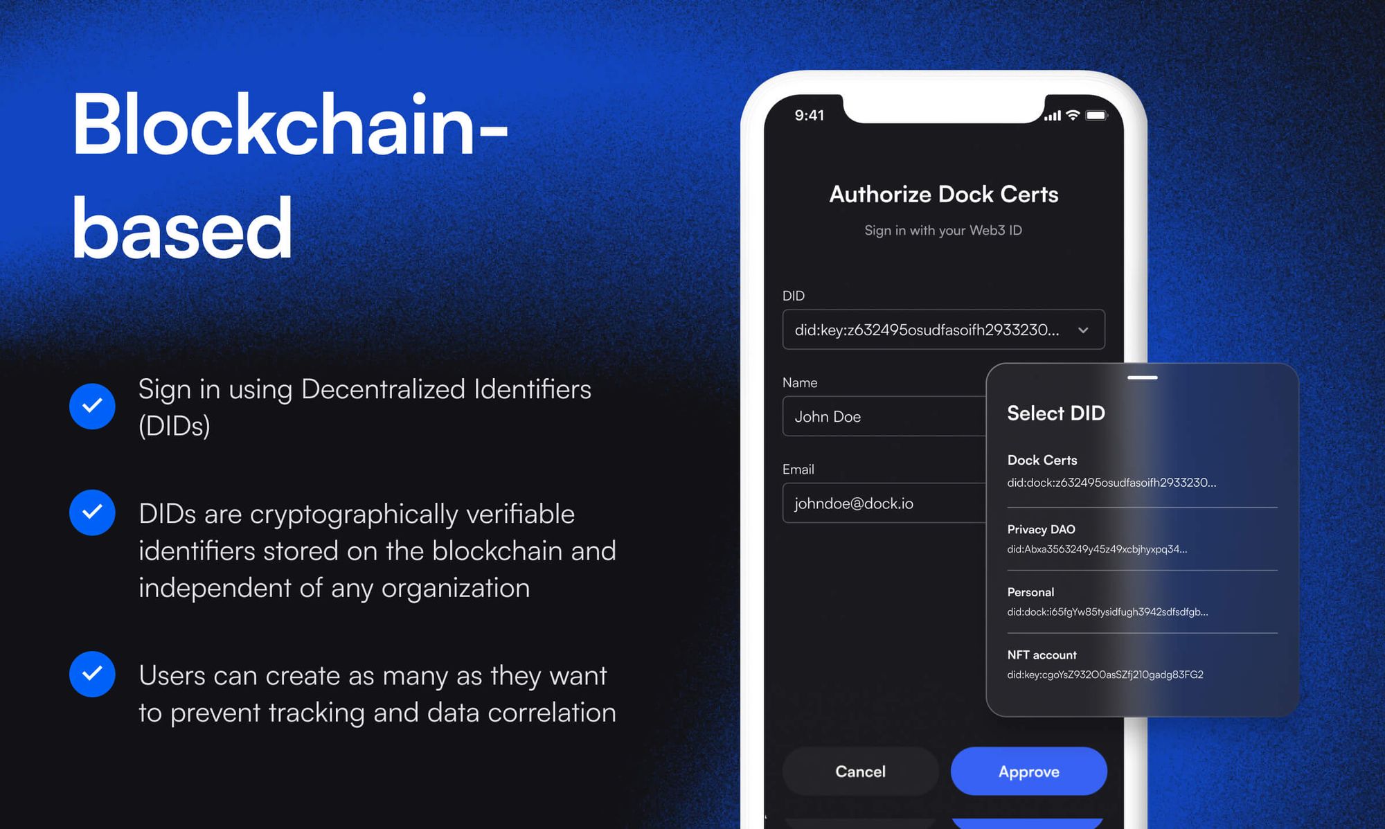 Dock is a Verifiable Credentials company that provides Dock Certs, a user-friendly, no-code platform, and developer solutions that enable organizations to issue, manage and verify fraud-proof credentials efficiently, securely, and at a lower cost. Dock enables organizations and individuals to create and share verified data.