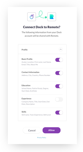 We deployed oAuth a couple months back, allowing you to login to Remote.com using your Dock account, and in August we added the ability to import your information in Dock, allowing new Remote.com users to instantly onboard and apply to jobs in seconds, saving over 30 minutes in comparison to standard new user onboarding. This is a big milestone and paves the way for 2-way data exchange, saving information and updates from Remote.com back to Dock and any other apps you’ve authorized.