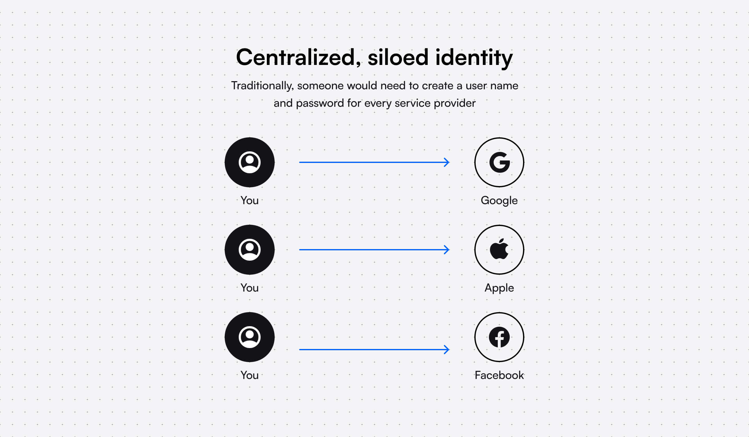 Decentralized identity systems allow users to gain control, store, and manage their own identities and data. Users decide how and when they share their data and with whom. Instead of being siloed in one place, data is decentralized to each user.