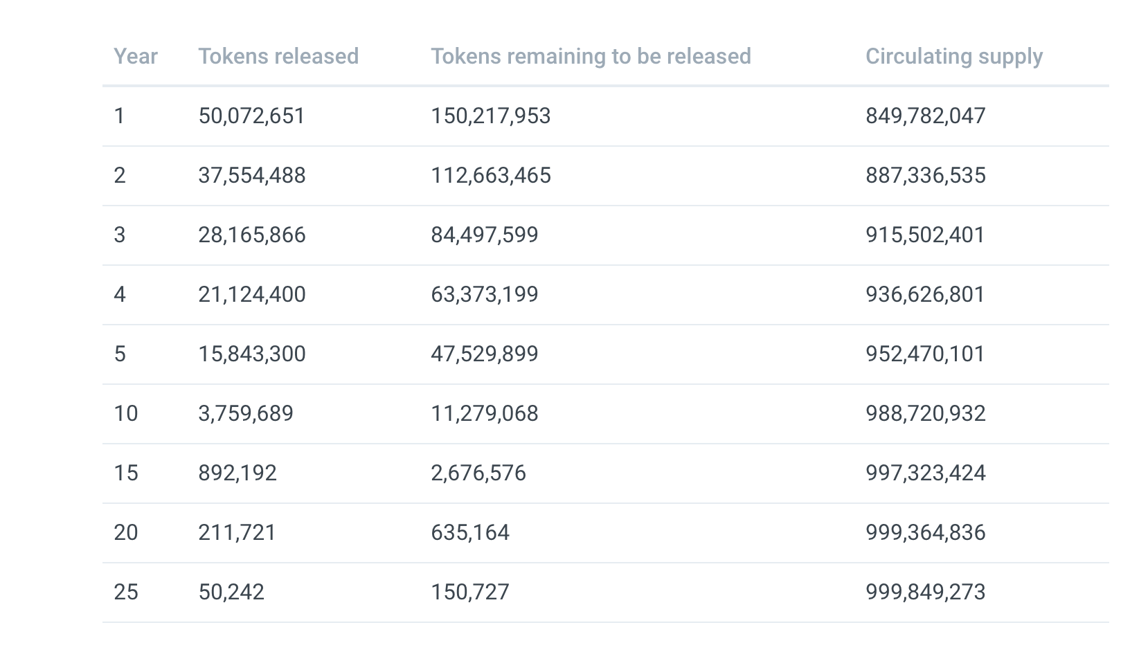 Each year, the network will release 25% of the remaining supply at most and the released tokens will be equally distributed across epochs, each of which lasts 10 days. Circa 200M tokens will be emitted over the course of the next 25 years.