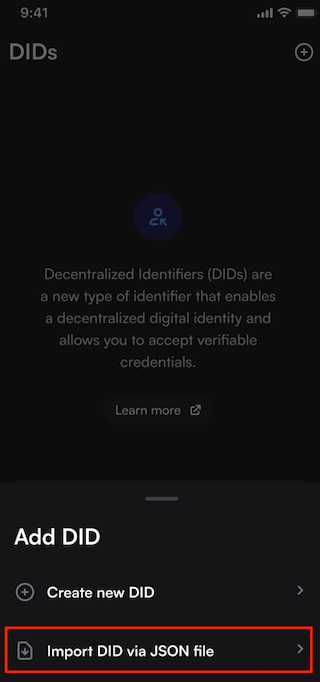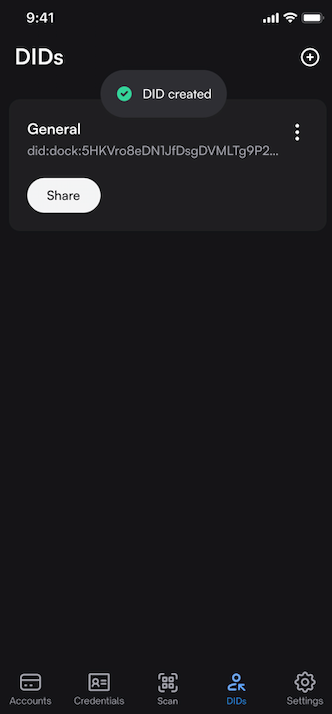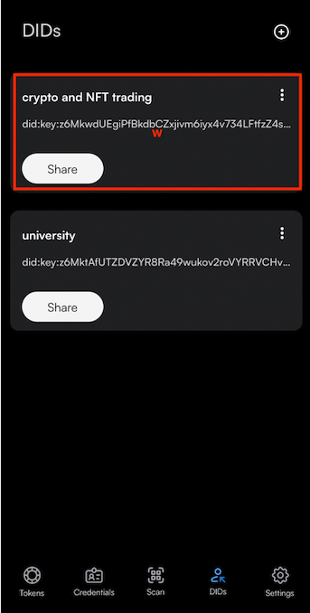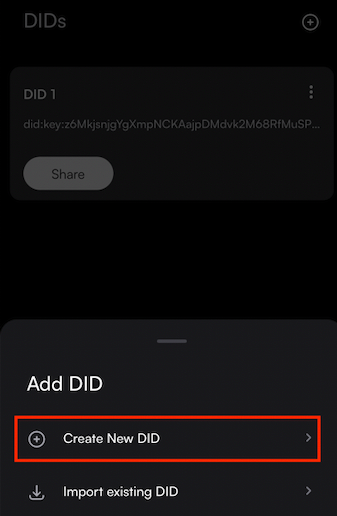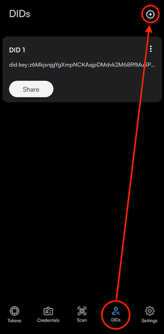 Step 1: Select DIDs at the bottom of your wallet and click on the + sign on the top right of the screen