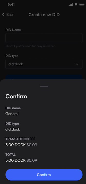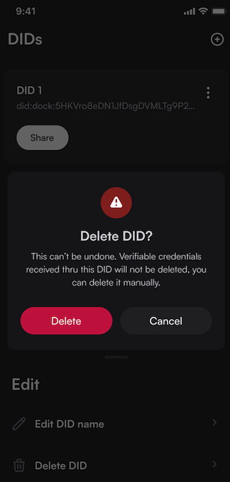 - With the Dock Wallet, users can securely create, export, import, edit, delete, and copy/share their DIDs. The wallet enables users to fully own, control, and manage their credentials that are issued as Verifiable Credentials such as a university degree or government ID.