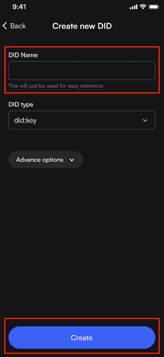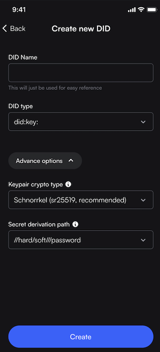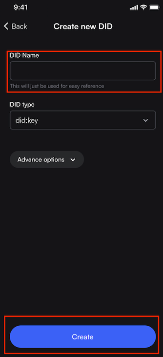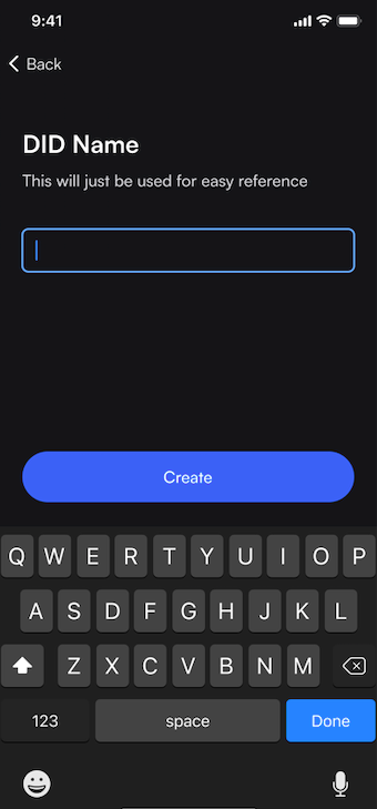 Step 3: Name your DID like educational credentials, NFTs, IDs etc. and select Create