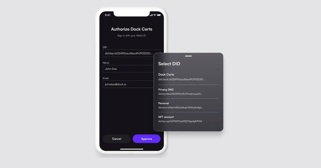 Decentralized identifiers enable organizations and people to fully own and control their data. People can create as many DIDs as they want for different interactions and purposes. Users can securely store their Verifiable Credentials on their Dock Wallet that are associated with their DIDs.