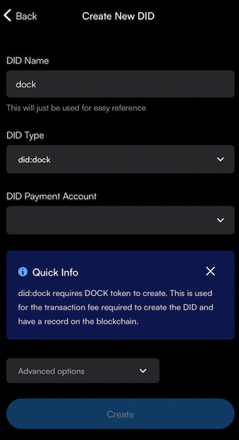 Step 7: This is the next step if you select did:dock. Name your DID and select the DID Payment Account. If you have multiple accounts, you will see an extra field on this screen for you to choose which account to use to pay for the DID.