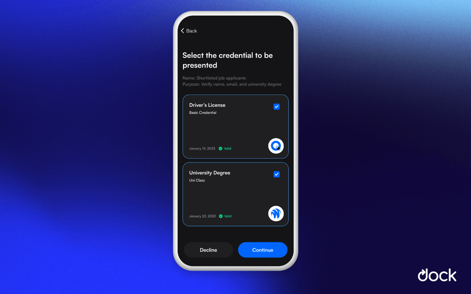 By creating a Verification QR Code in Dock Certs, you can request and instantly verify any document from your users. Users who scan the Verification QR Code with their Dock Wallet receive a notification of what data you are requesting. Once the user accepts, Dock instantly verifies the authenticity of the data and presents you with the verification result.