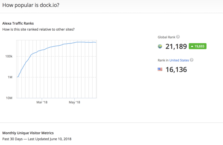 Dock has continued to quickly become one of the most trafficked blockchain websites on the internet. The screenshot below from Alexa.com updated June 10th, 2018 (a publicly available tool to monitor website traffic) shows how we have continued to accelerate our growth and now ranks 21,189 in the world.