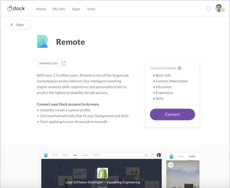 In Remote.com’s case, you’re able to search and apply to custom-tailored jobs in seconds instead of spending 30+ minutes setting up a new account, creating a profile and setting your job preferences. This seamless integration of personal data — controlled by you — is a glimpse into the future of Web 3.0 and what the Dock network is revolutionizing.