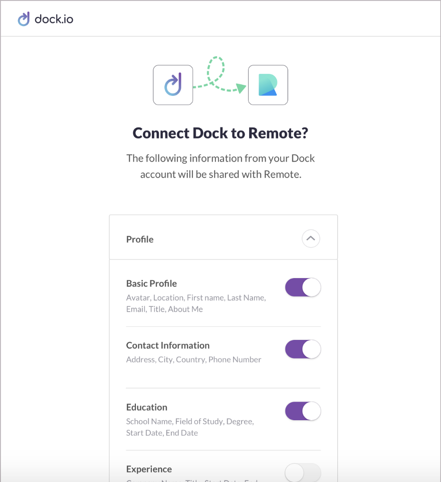 Connect in seconds. Connecting via the Dock App Marketplace lets you seamlessly import your preferred information into the app — which means you can bypass onboarding processes and dramatically shortening the time spent onboarding.